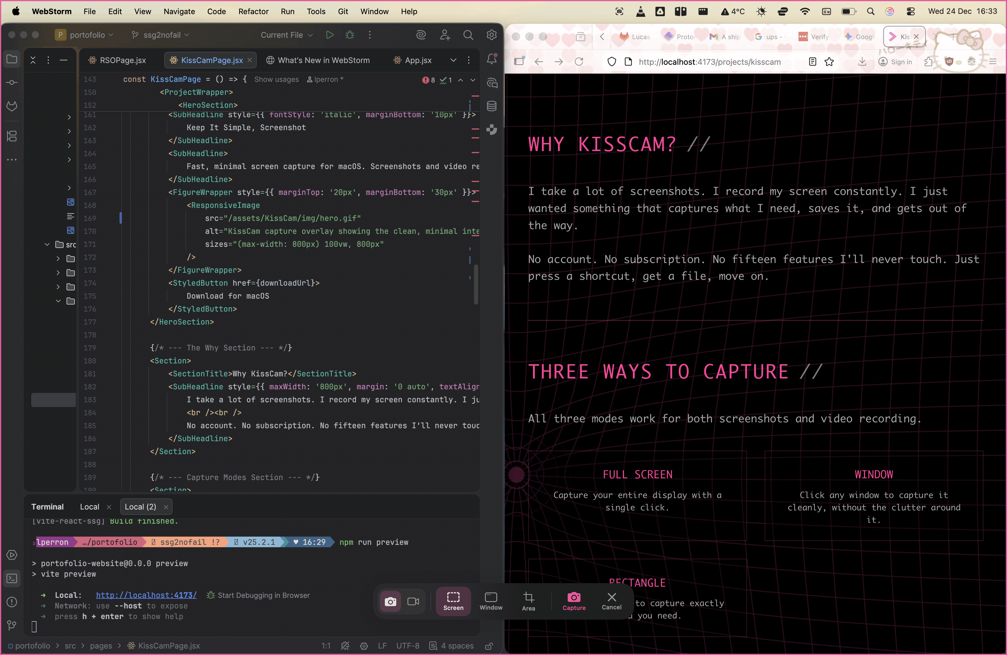 Hit ⌘⇧7 for a screenshot. Hit ⌘⇧8 to start recording. No overlay, no extra clicks, no interruption. KissCam remembers your last settings: same mode, same region, same format. It just does it.
